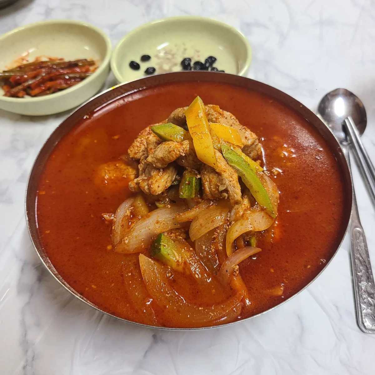 평동 ‘명화식육식당’ 은 1970년대에 개점을 하여 약 40여년 이상 이어온 곳이다. 대로변에 위치해 있고 신경써서 가지 않으면 그냥 지나칠 것 같은 세월의 흔적을 가득 담은 외관을 하고 있다. 애호박 국밥은 애호박과 당근, 양파에 고추장 양념을 넣어서 끓인 옛날식 국밥이다. 붉은 색깔과 다르게 지나치게 자극적이지 않고 양도 많고 든든하게 먹을 수 있는 것이 특징. 살코기와 비계가 적절하게 배합되어 있는 돼지고기를 넣은 후에 푹 끓여 내어 진한 맛이 일품이다.