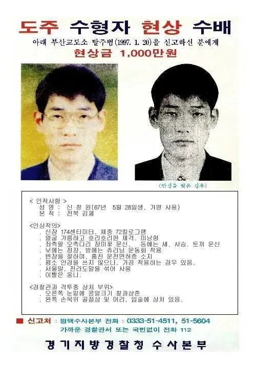 1997년 1월 20일 새벽 3시,부산교도소에서 죄수 신창원 탈옥금방 잡힐 줄 알았으나 빈집도 털고열심히(?) 도망다닌 신창원 전국구급으로 이슈가 되자당시에는 역대 최고 현상금이었던 5,000만원까지 인상형사가 신창원 동거녀를 성폭행하는 사건도 발생을 하고경찰이 추적해도 도망가는 기행을 벌이던 신창원 2년 6개월동안 요리조리 잘 도망다니던 신창원은결국 1999년 7월 16일, 전라남도 순천시 한 아파트에서HID 출신 가스검침원의 제보로 인해 검거당한다.신고자는 알려졌다시피 경찰 특채로 채용 피부과 의사가 일부러 7일간 피부를 망치면 생기는 일옆나라 바둑 1인자가 한국 1인자에게 훈수 둔 썰영국에서 공무원급으로 힘들다는 시험미국에서 꾸준히 팔린다는 살균 미처리 우유스페인 남부서 고속열차 충돌…“최소 21명 사망”