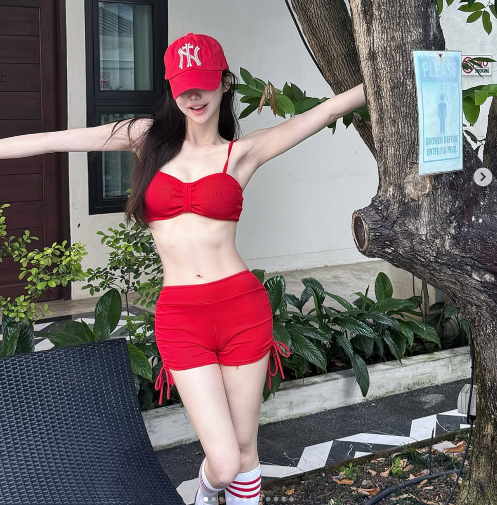 빨간색 비키니에 같은 색상의 버킷햇을 매치했는데, 이렇게 컬러를 통일해주면 시선이 끊기지 않아 비율이 훨씬 더 좋아 보이는 효과가 있거든요.