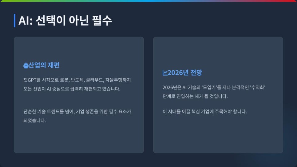 챗GPT를 시작으로 로봇, 반도체, 클라우드, 자율주행까지 모든 산업이 AI 중심으로 재편되고 있죠.