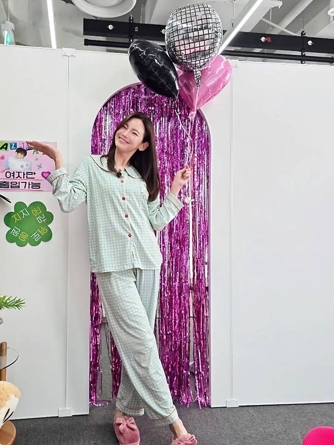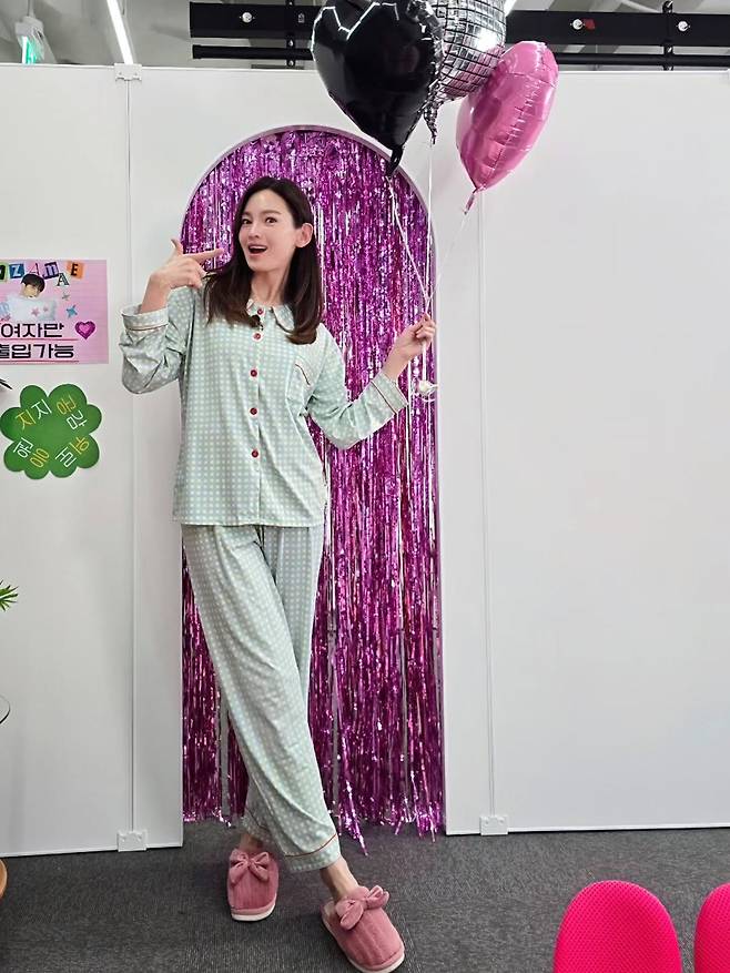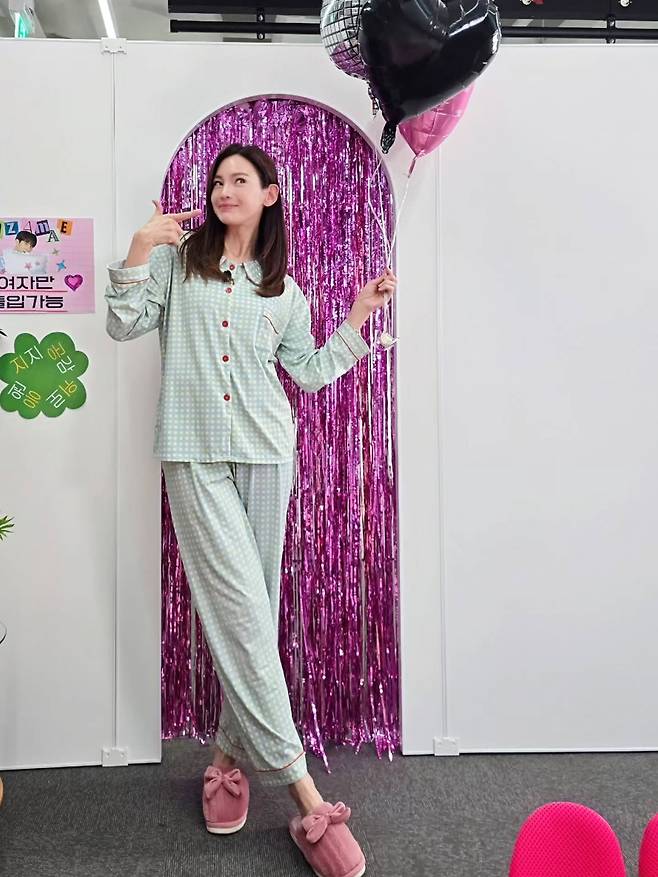 정가은이 화려한 핑크색 파티 커튼과 풍선을 배경으로, 특유의 밝고 건강한 매력이 돋보이는 근황을 전했어요.