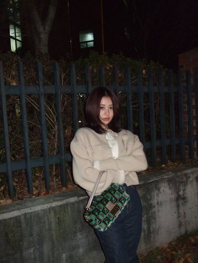 허윤진, 베이지 가디건에 생지 데님 매치... 세련미 넘치는 겨 스트릿 패션