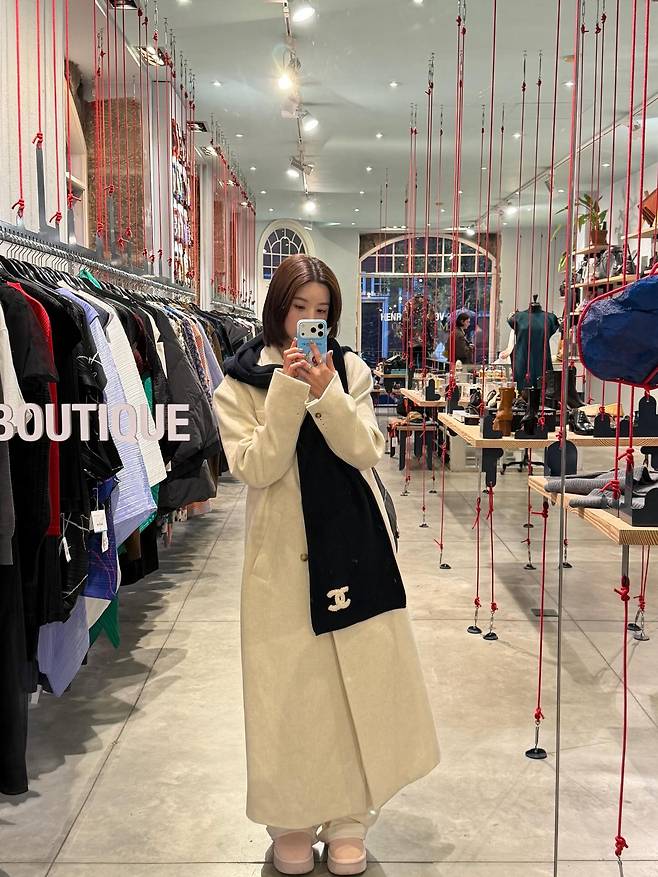 권은비가 세련된 분위기의 패션 매장을 배경으로, 그녀만의 독보적인 아우라가 돋보이는 거울 셀카 근황을 전했어요.