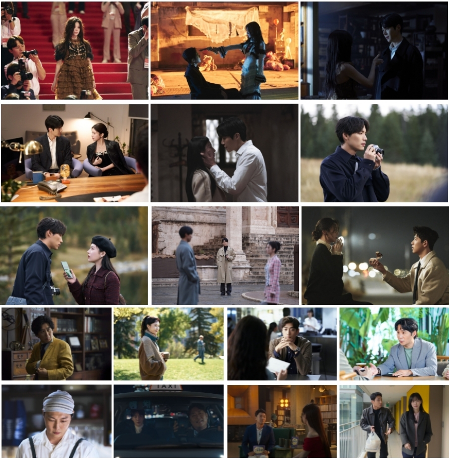 이 가운데 베일을 벗은 미공개 스틸은 달콤함과 긴장감을 오가는 ‘주호진’(김선호)과 ‘차무희’(고윤정)의 관계성은 물론, 두 사람의 서사에 풍성함을 더해준 인물들의 다채로운 순간을 포착하고 있다. 밝고 당당한 ‘무희’의 이면에 숨겨진 ‘도라미’의 어둡고 강렬한 모습은 ‘무희’로부터 ‘호진’을 멀어지게 하려는 ‘도라미’의 행보를 상기시키며 긴장감을 더한다. 입맞춤 직전의 ‘호진’과 ‘무희’의 모습은 수차례 엇갈림 끝에 서로를 이해하고, 마침내 서로의 사랑의 언어를 통역하게 된 두 사람의 관계 변화를 보여주며 깊은 설렘을 남긴다. 여기에 ‘무희’와 함께 ‘로맨틱 트립’에 출연하며 처음에는 ‘무희’를 탐탁지 않게 여겼지만, 점차 마음을 열며 ‘호진’에게 묘한 당혹감을 안겨준 ‘히로’(후쿠시 소타)의 모습 역시 눈길을 끈다. 또한 ‘로맨틱 트립’ PD ‘신지선’(이이담)에게 프러포즈를 하는 ‘무희’의 매니저 ‘김용우’(최우성)의 모습은 평소 티격태격하던 두 사람의 예상치 못한 러브라인을 보여주며 또 하나의 관전포인트로 재미를 더한다. 여기에 저명한 작가이자 ‘호진’의 든든한 조력자인 ‘김영환’(김원해)과 ‘로맨틱 트립’의 숨은 주역인 ‘조영아’(백주희)는 극에 풍성함을 더했다.
