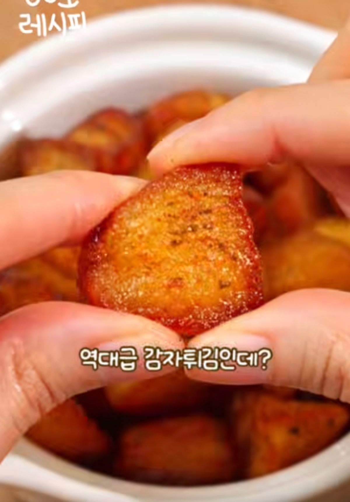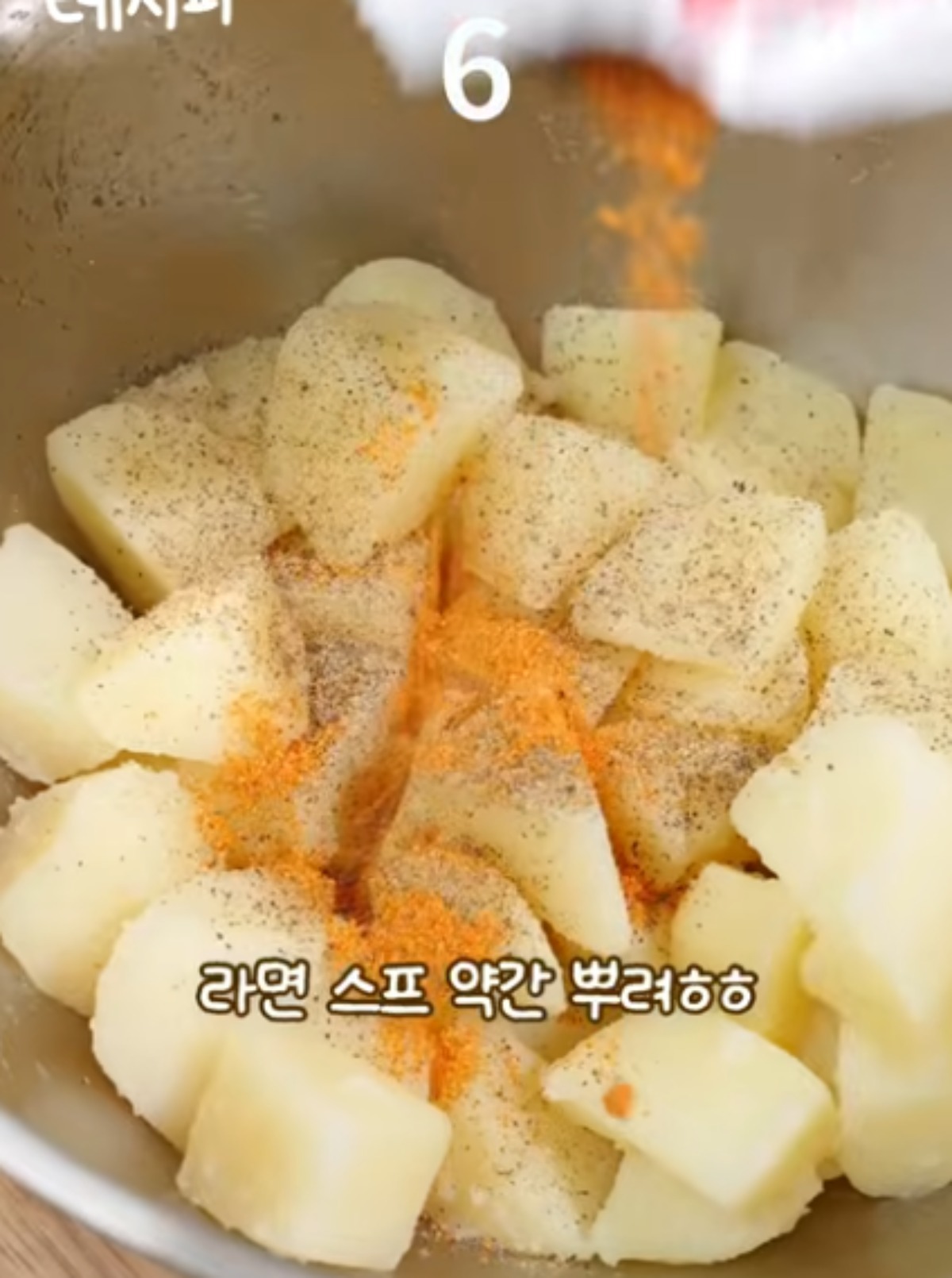 유튜브 '지현쿡'에 따르면, 레시피는 다음과 같다. 먼저 감자를 약간 익혀서 후추를 약간 뿌린다. 이어 라면 스프를 약간 뿌려준다. 기호에 맞게 소금, 설탕 등 반 스푼씩 넣어 간을 맞춰준다. 파슬리는 기호에 따라 첨가하면 된다.