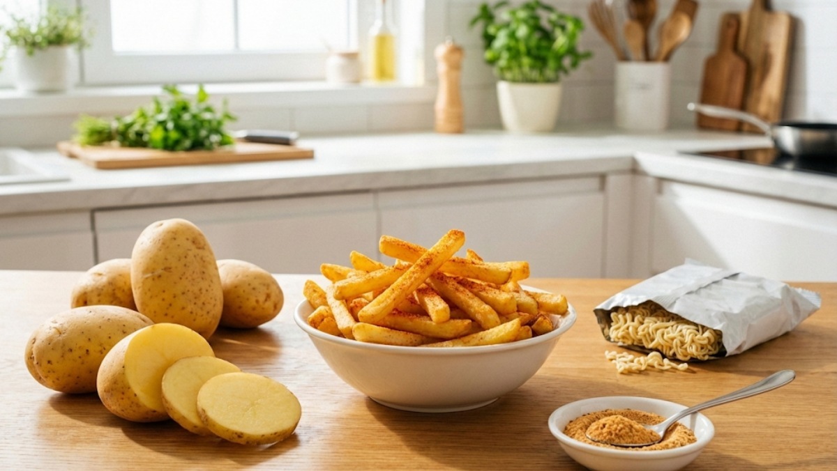 감자튀김의 완성도를 높이기 위해서는 감자의 전분기를 제거하는 과정이 필수적이다. 조리 전 감자를 찬물에 10분 정도 담가두면 표면의 전분이 빠져나가 튀겼을 때 더욱 바삭한 식감을 얻을 수 있다. 물기를 완전히 제거한 후 라면 스프와 함께 섞어 에어프라이어나 팬에 구우면, 스프 속의 미세한 입자들이 감자 표면에 고르게 밀착되어 바삭한 코팅층을 형성한다. 이때 라면 스프의 염분이 감자의 수분을 적절히 조절하여 '겉바속촉' 상태를 오래 유지하도록 돕는다.