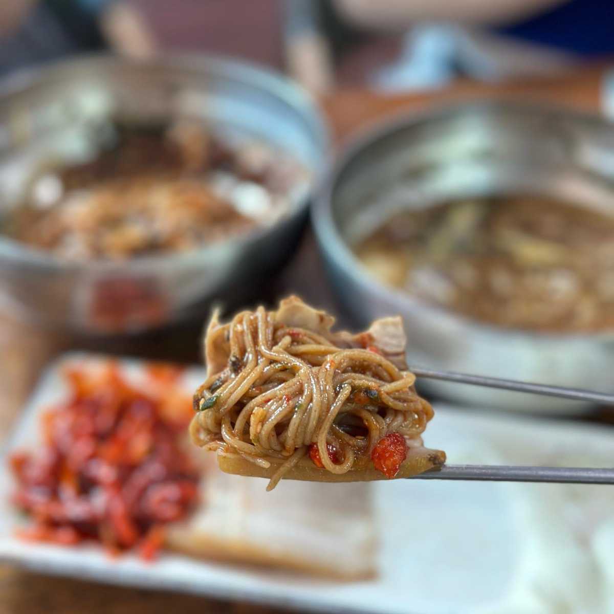 메밀국수와 편육으로만 이루어진 단촐한 메뉴지만 오픈런 하지 않으면 긴 웨이팅을 감수해야 한다는 고성 ‘백촌막국수’. 메밀국수는 비빔과 물로 나뉘어 있지 않고 돌돌 말린 메밀면이 나오면 취향에 따라 들기름을 뿌리거나 함께 나오는 동치미 육수나 양념장을 넣어 먹으면 되는 방식이다. 시원하면서 담백한 동치미가 아주 일품으로 메밀면과 아주 잘 어울린다. 여기에 야들야들 간이 잘 배어있는 수육에 백김치와 명태 회 무침을 올려 먹으면 잊지 못하는 맛이라는 말이 실감 나는 맛이다.
