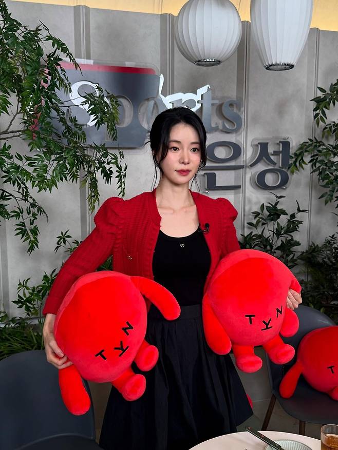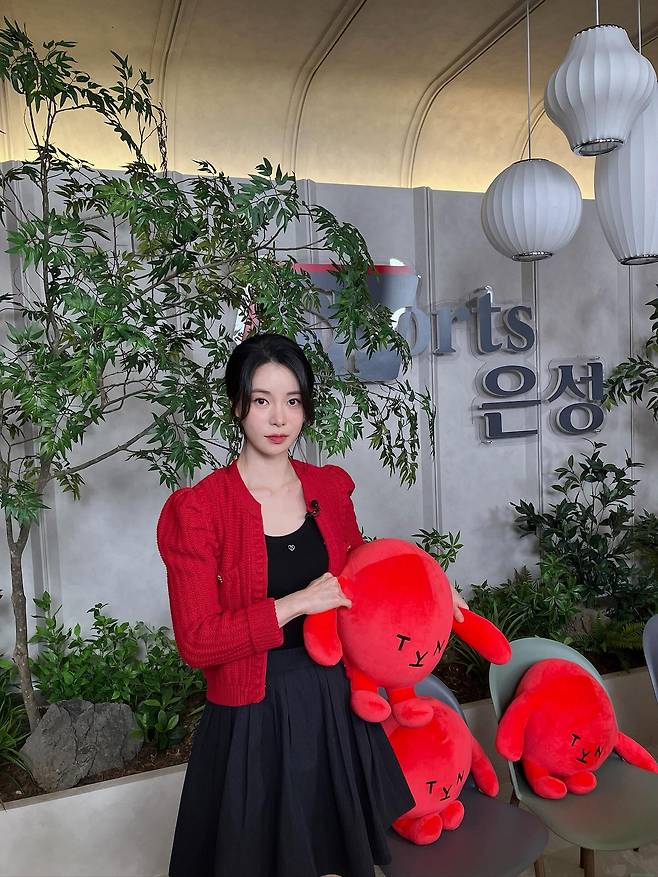 여기에 깔끔하게 묶어 올린 헤어스타일과 붉은색 인형 소품들이 어우러져 그녀만의 상큼하고 발랄한 에너지를 극대화했어요.