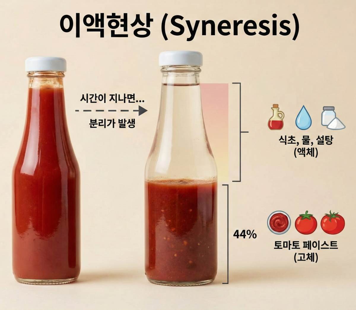 이 현상은 과학적으로 '이액현상'이라 불린다. 케첩은 토마토 페이스트 같은 고형 성분과 식초·설탕물 등 액체 성분이 섞인 혼합물이다. 시간이 지나면 두 성분이 서로 완전히 붙어 있지 못하고 분리되는 성질을 보이는데, 이때 상대적으로 가벼운 수분이 위로 올라간다. 병을 세워 두면 입구 쪽에 수분이 모이고, 짜는 순간 그 물이 먼저 나오게 된다.