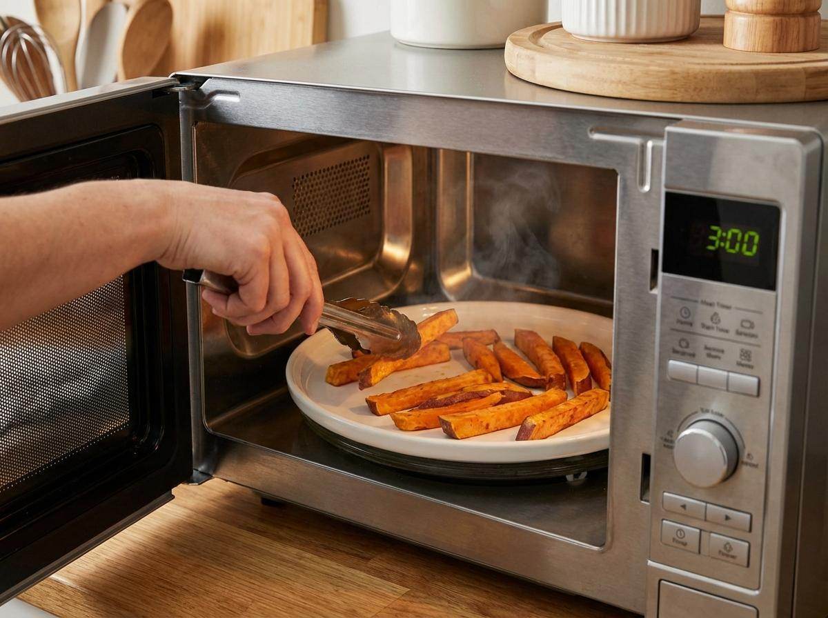 섞은 고구마는 접시에 키친타월을 깔고 최대한 겹치지 않게 펼친다. 전자레인지 조리에서 가장 중요한 부분이다. 겹치면 수분이 빠지지 않아 눅눅해진다. 펼친 상태로 전자레인지에 넣고 3분간 돌린 뒤 한 번 뒤집는다. 다시 3분, 이후 고구마를 다시 흩어 펼쳐 3분을 더 돌린다. 총 9분 조리다.