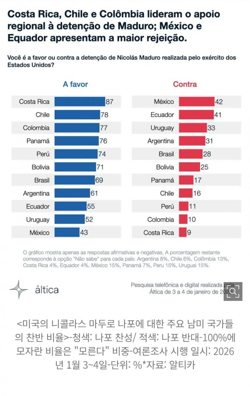 페루에서는 74%, 칠레에서는 63%가 마두로 체포에 동의했으며, 멕시코를 제외한 대부분의 남미 국가에서 찬성 여론이 우세함