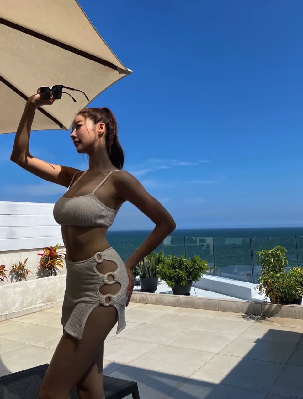 푸른 바다가 보이는 해변 풀장을 배경으로, 니트 텍스처의 비키니를 입고 파라솔 아래 앉은 모습이 공개됐다.