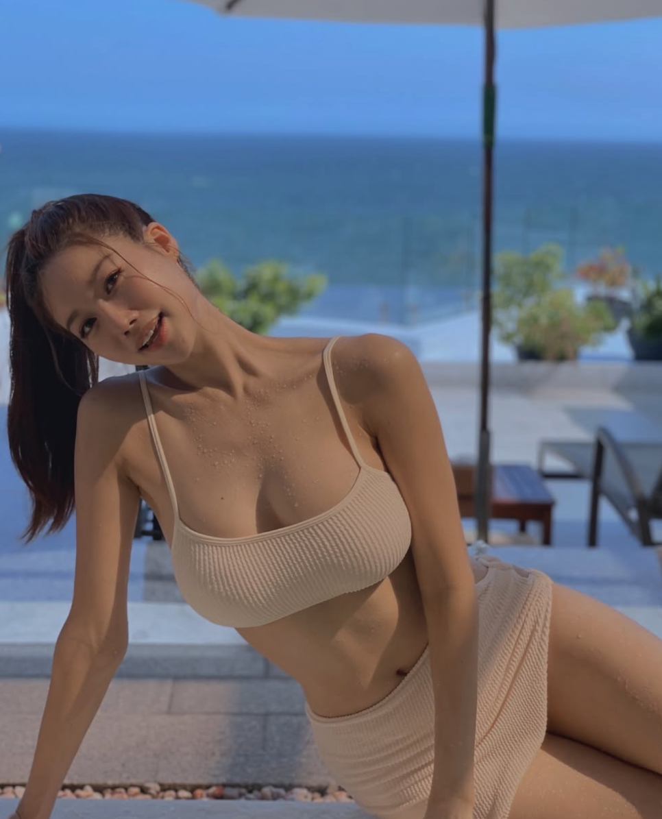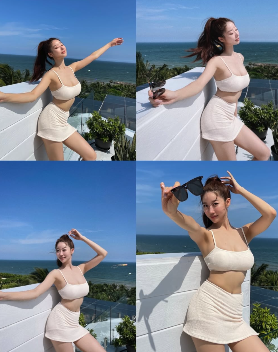 베이지 니트 비키니, 화이트 레이스 비키니, 스카이 블루 비키니까지—컬러와 스타일을 달리한 세 가지 룩을 완벽히 소화하며 미스코리아 출신다운 글래머 몸매와 우아한 분위기를 동시에 과시했다. 특히 발리의 유명 리조트 '알라스 하룸'에서 촬영한 정글 뷰 사진들은 "이게 진짜 미스코리아 몸매"라는 찬사를 이끌어냈다.