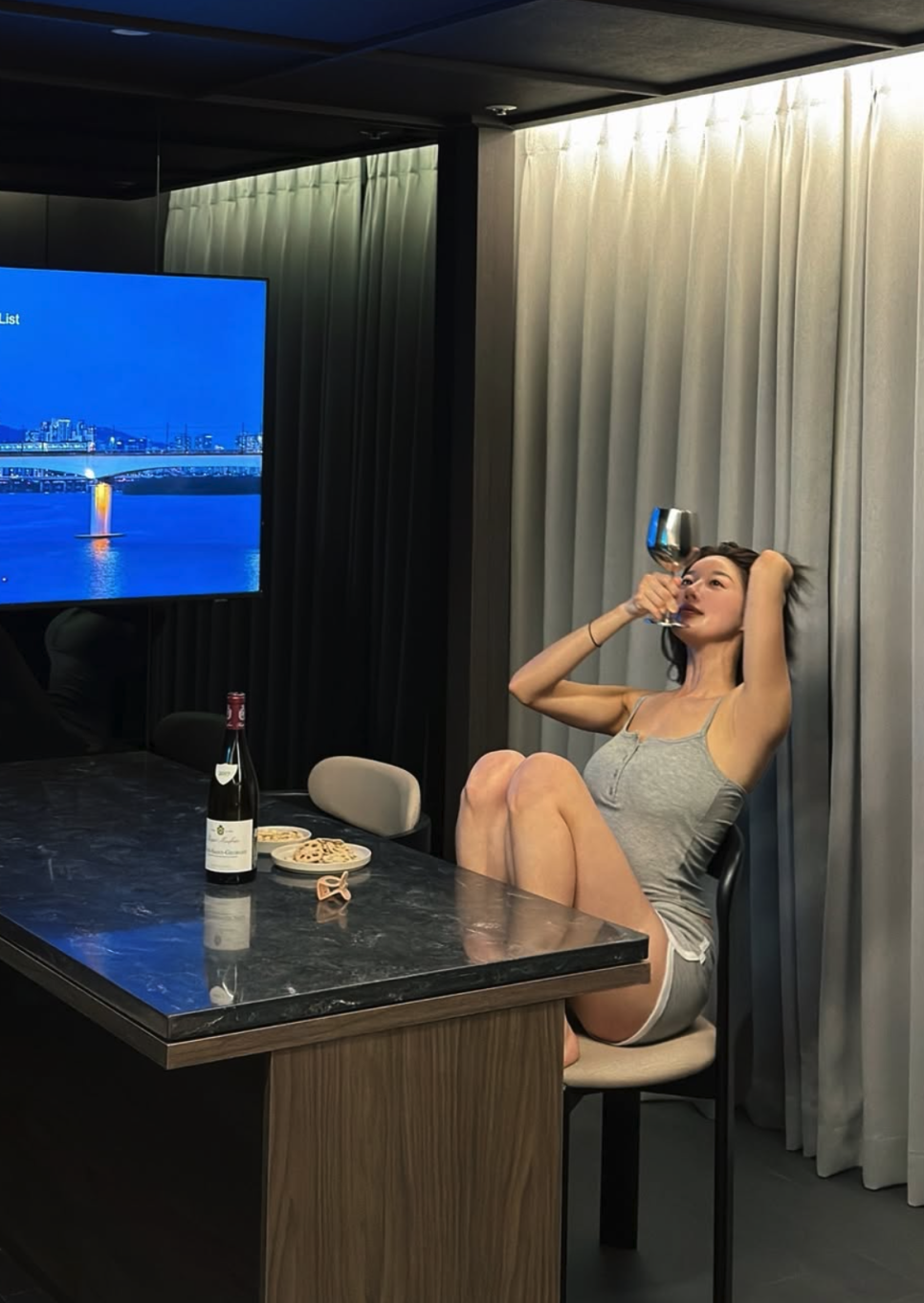 거울 앞에서 와인잔을 들고 포즈를 취한 사진, 야경을 배경으로 와인을 즐기는 사진 등 다양한 컷이 공개됐다.