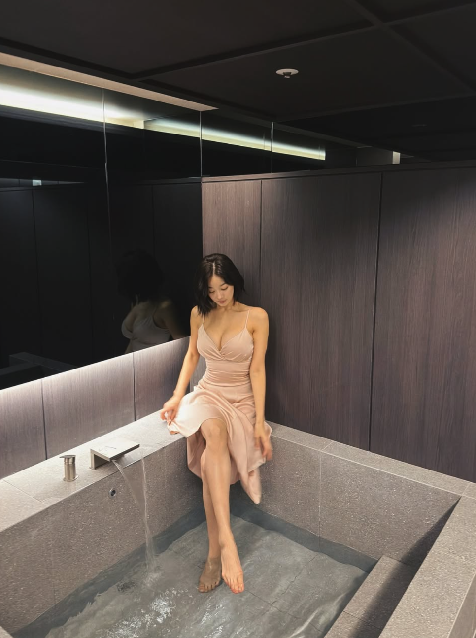 풀사이드에 앉아 고개를 살짝 기울이며 미소 짓는 모습은 화보 촬영 현장을 방불케 했다.