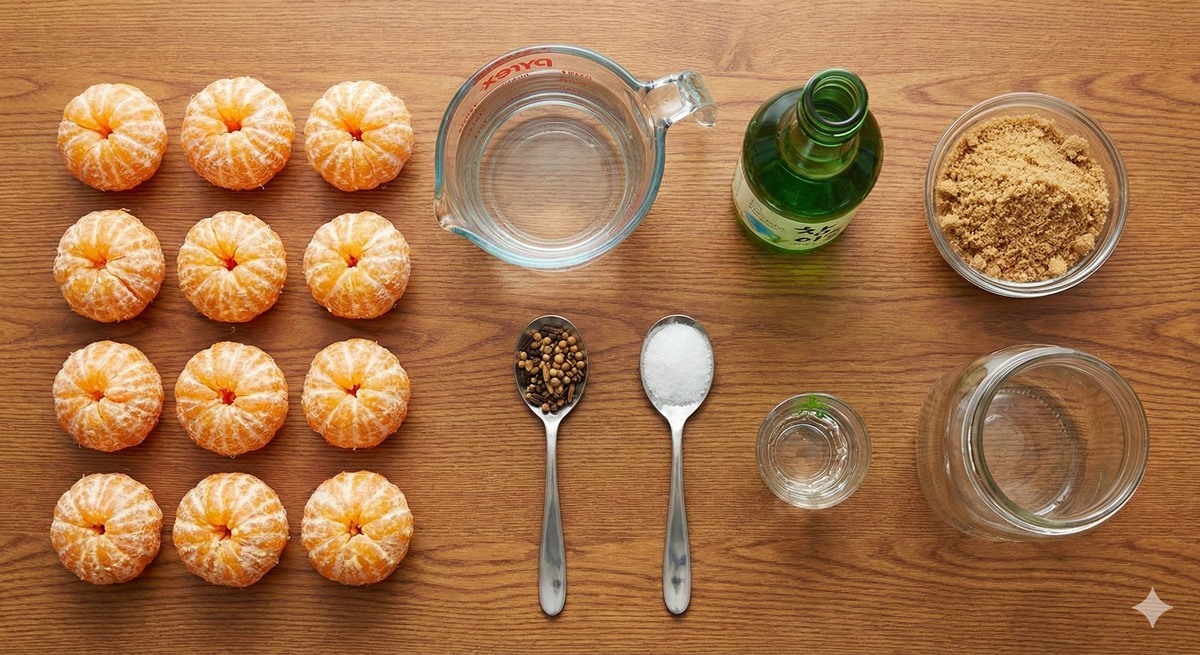 소주가 핵심, 간단한 재료로 완성귤 피클 제작에는 특별한 재료가 필요 없다. 껍질 벗긴 귤 10개(약 620g), 물 450mL(종이컵 2컵 반), 식초 120mL(종이컵 7할), 황설탕 1컵만 준비하면 된다. 여기에 피클링 스파이스 1큰술, 소금 1큰술, 그리고 핵심인 소주 40mL(소주잔 한 잔 또는 종이컵 1/4컵)를 넣는다.