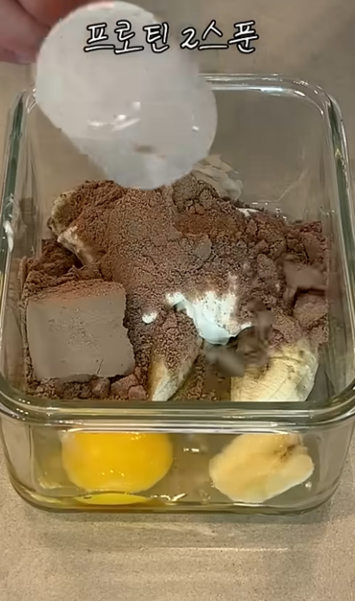 방법은 매우 간단해서 집에서도 쉽게 따라할 수 있다. 유튜브 '준규빌더'에 따르면, 먼저 바나나 위에 그릭요거트 2스푼, 계란 1, 프로틴 2스푼을 넣는다.