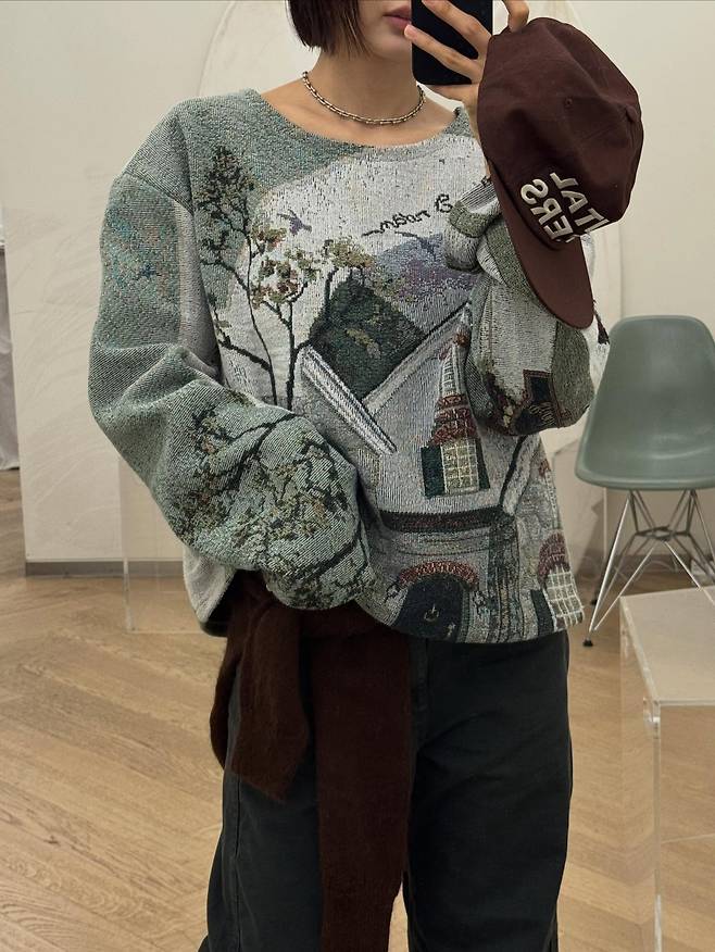 사진 속 금새록은 마치 한 폭의 동양화를 옮겨놓은 듯한 독특한 풍경 그래픽이 들어간 오버핏 니트를 착용해 시선을 단숨에 사로잡았는데요.