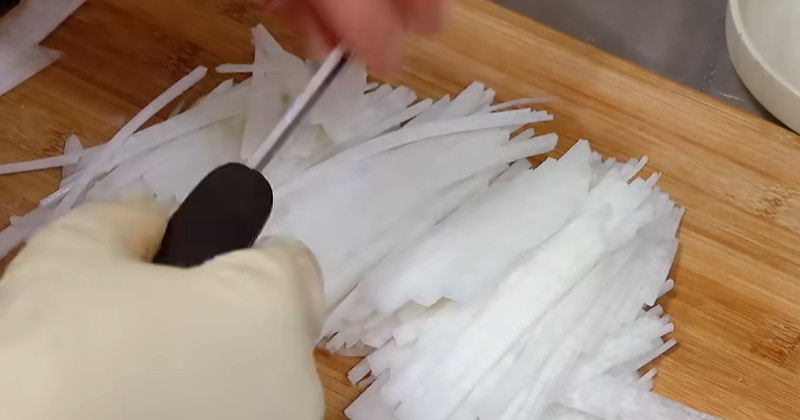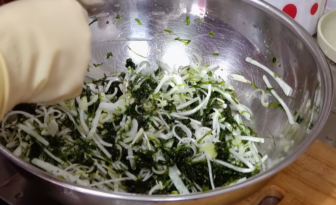 무는 겨울무를 사용하는 것이 가장 좋다. 겨울무는 수분이 풍부하면서도 단맛이 강해 파래의 바다 향을 부드럽게 감싸준다. 무는 최대한 가늘게 채썰어야 한다. 굵으면 파래와 따로 놀고, 씹는 질감도 거칠어진다. 채 썬 무는 소금에 절이지 않는다. 대신 바로 양념에 들어가야 아삭한 식감과 자연스러운 단맛이 살아난다.