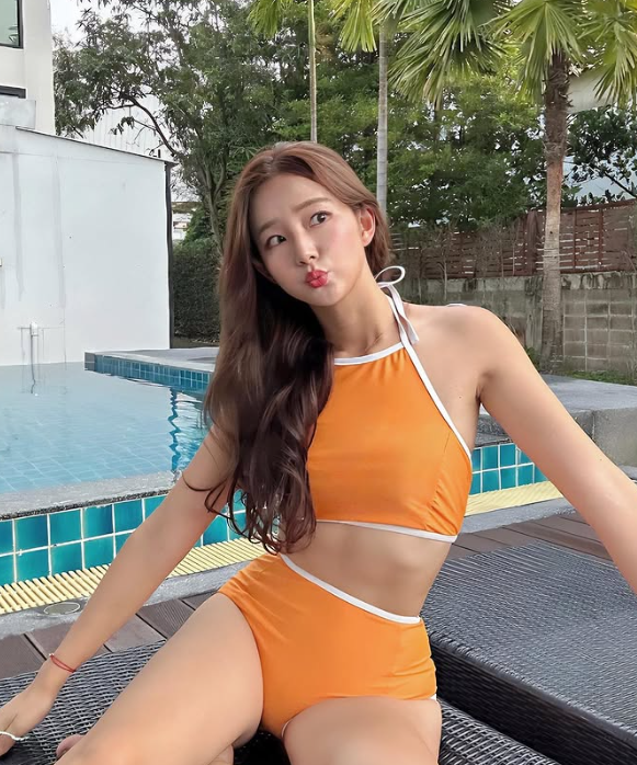 화보와는 또 다른 매력을 보여준 사진은 바로 쨍한 오렌지 컬러의 비키니 룩이었는데요!