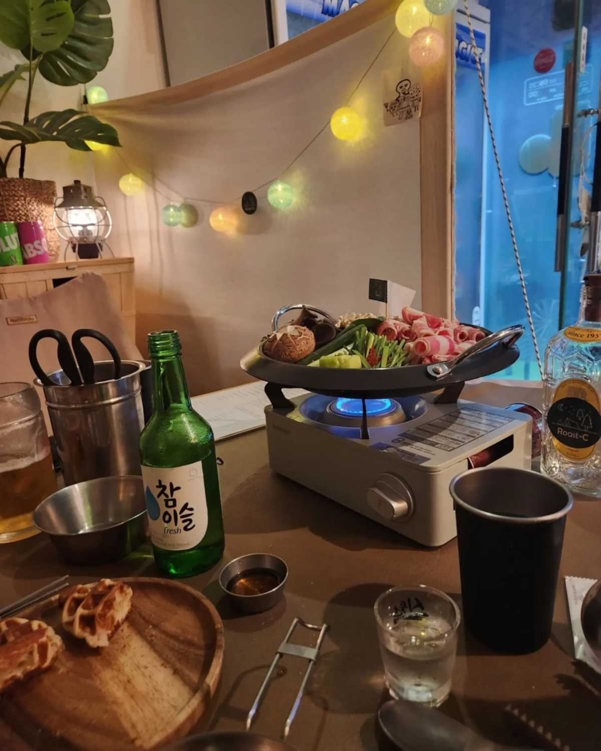 진짜 캠핑을 온 기분을 느낄 수 있는 캠핑 포차 청주 ‘로스트씨’. 가게 안에 각종 캠핑 용품과 진짜 불은 아니지만 스크린으로 모닥불을 켜놓아서 간접적으로나마 불멍을 즐길 수 있어 진짜 캠핑을 하러 온 기분을 낼 수 있다. 밤 9시가 지나면 야간 캠핑으로 불을 끄고 은은한 조명만 켜 놓는 것도 캠핑 감성을 느낄 수 있는 부분. 대표 메뉴는 로씨전골로 질 좋은 소고기가 듬뿍 들어가 있고 각종 채소와 버섯으로 맛을 낸 전골로 칼칼한 국물이 일품이다. 여기에 기본 안주로 내어주는 크로플을 직접 구워 먹을 수 있어 캠핑 분위기를 물씬 느낄 수 있다.