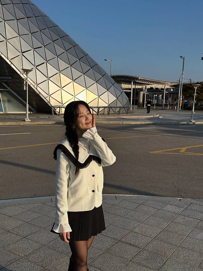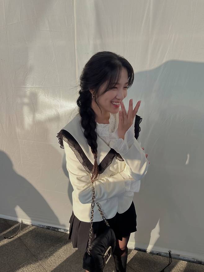 낮게 땋아 내린 헤어스타일 역시 이번 룩의 클래식한 무드와 완벽하게 어우러지며 그녀만의 단아하면서도 발랄한 이미지를 완성했습니다.