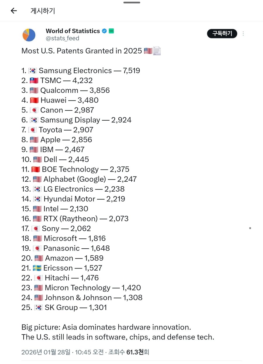 2025 부여된 미국 특허 기업 순위