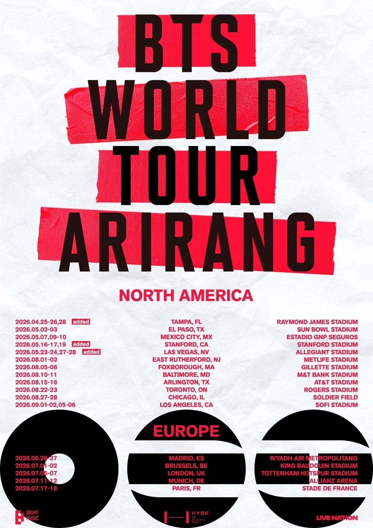 방탄소년단은 오는 4월 25·26·28일 미국 탬파 레이먼드 제임스 스타디움을 시작으로 엘파소, 멕시코시티, 스탠퍼드, 라스베이거스 등 12개 도시에서 31회에 걸쳐 북미 공연을 연다. 이 가운데 탬파, 스탠퍼드, 라스베이거스에서는 현지의 뜨거운 호응 덕에 각 1회차씩 추가 공연이 확정됐다.