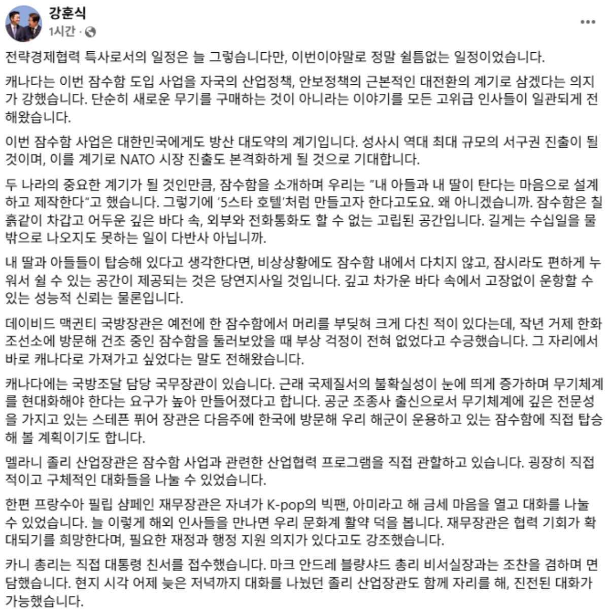 우리 잠수함의 해외 수주를 지원하기 위해 대통령 전략경제협력 특사 자격으로 캐나다를 방문 중인 강훈식 대통령 비서실장이 현지에서 고위급 인사들을 잇달아 만나 수주를 위한 총력전을 펼쳤다. 강 비서실장은 29일 오전 자신의 SNS를 통해 이번 방문의 성과와 소회를 밝히며 우리 잠수함의 우수성과 안전성을 강조했다. 특히 그는 잠수함을 소개하는 과정에서 "우리는 내 아들과 딸이 탄다는 마음으로 설계하고 제작한다"라는 진심을 전하며 캐나다 측의 공감을 이끌어냈다고 밝혔다.