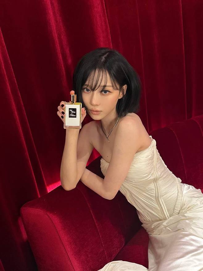 여기에 은은한 광택이 도는 실크 소재의 드레스와 한 손에 든 고급스러운 향수 병은 그녀를 단순한 아이돌을 넘어 하나의 아이코닉한 뮤즈처럼 보이게 합니다.