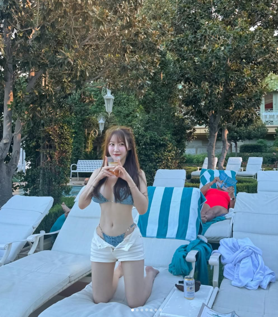 특히 그린 컬러 비키니는 자연광 아래에서 그녀의 육감적인 실루엣과 볼륨감을 더욱 돋보이게 만들었습니다.