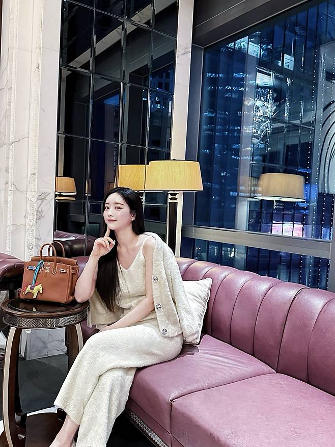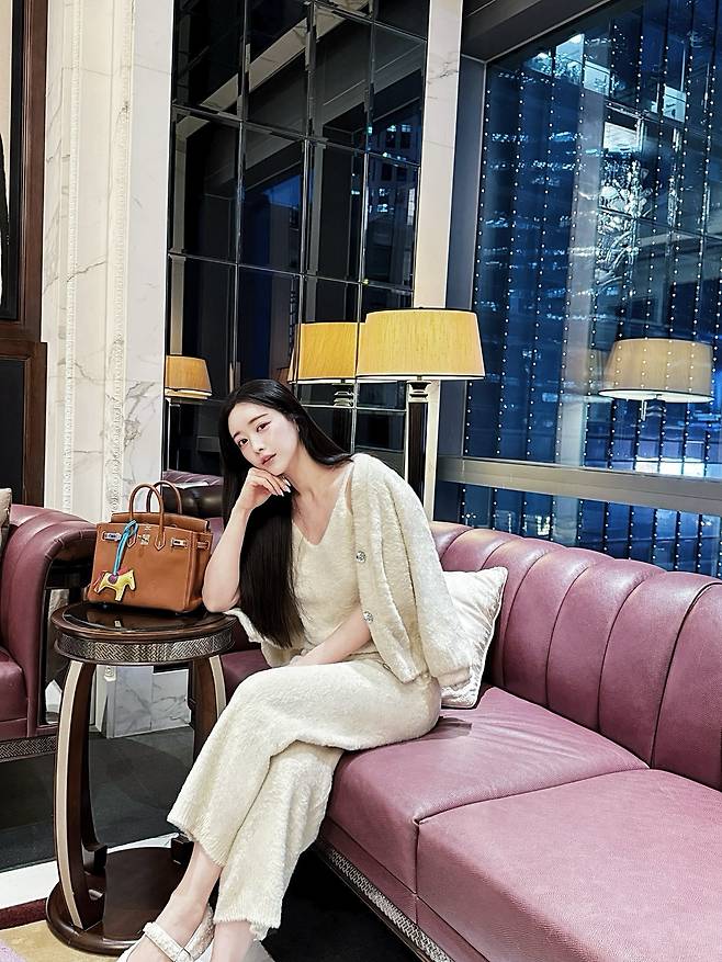 사진 속 홍수아는 고급스러운 와인빛 가죽 소파에 앉아 여유로운 미소를 짓고 있는데, 그녀의 맑고 투명한 피부와 찰랑이는 긴 생머리가 조명과 어우러져 진정한 '여신 아우라'를 발산하고 있답니다.