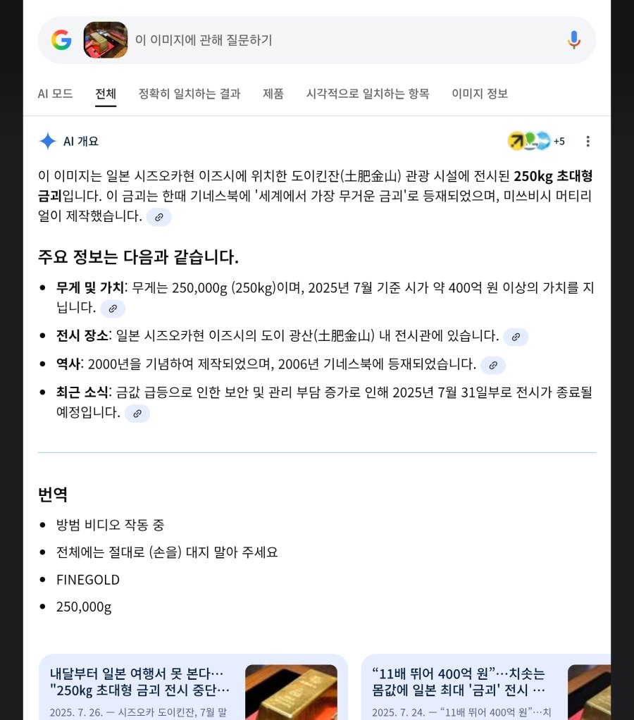지금은 보험료가 너무 올라서 전시 중지되었다고.. 오늘 금 1kg 시세 약 2.5억 625억 짜리 금괴 전시 초기 가격 약 40억 학교급식법 개정안 국회 통과 순간 급식 노동자분들70대 노모가 자녀들 몰래 적어둔 유서현재 난리난 국중박 이순신 장군님 신상 굿즈이용자수 급감했다는 쿠팡 근황한국에서 절대 성형수술 하지 말라는 일본 성형외과의사