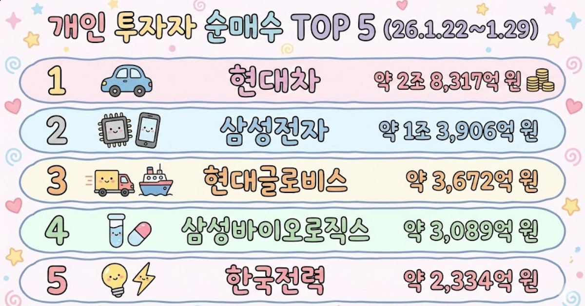 2026년 1월 22일부터 1월 29일까지 국내 유가증권시장(KOSPI)에서 개인 투자자들은 현대차와 삼성전자를 필두로 대형 우량주에 대한 집중적인 매수세를 기록하며 시장 흐름을 주도했다. 이 기간 개인 투자자들의 순매수 상위 5개 종목은 현대차 삼성전자 현대글로비스 삼성바이오로직스 한국전력 순으로 집계되었으며 미래 모빌리티와 반도체 바이오 등 핵심 국가 전략 산업군에 자금이 집중되는 양상을 나타냈다.