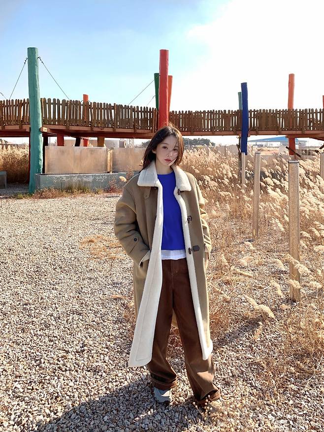 사진 속 강민경은 부드러운 카멜 컬러에 화이트 양털 배색이 포인트인 롱 무스탕 코트를 선택해 따뜻하면서도 고급스러운 분위기를 연출했는데요.