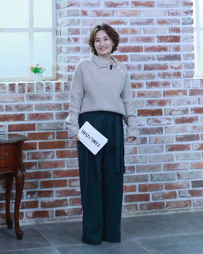 박경림은 고풍스러운 벽돌 배경 스튜디오에서 단아하면서도 세련된 패션 감각을 뽐내며 진행자로서의 독보적인 존재감을 과시하고 있어요.
