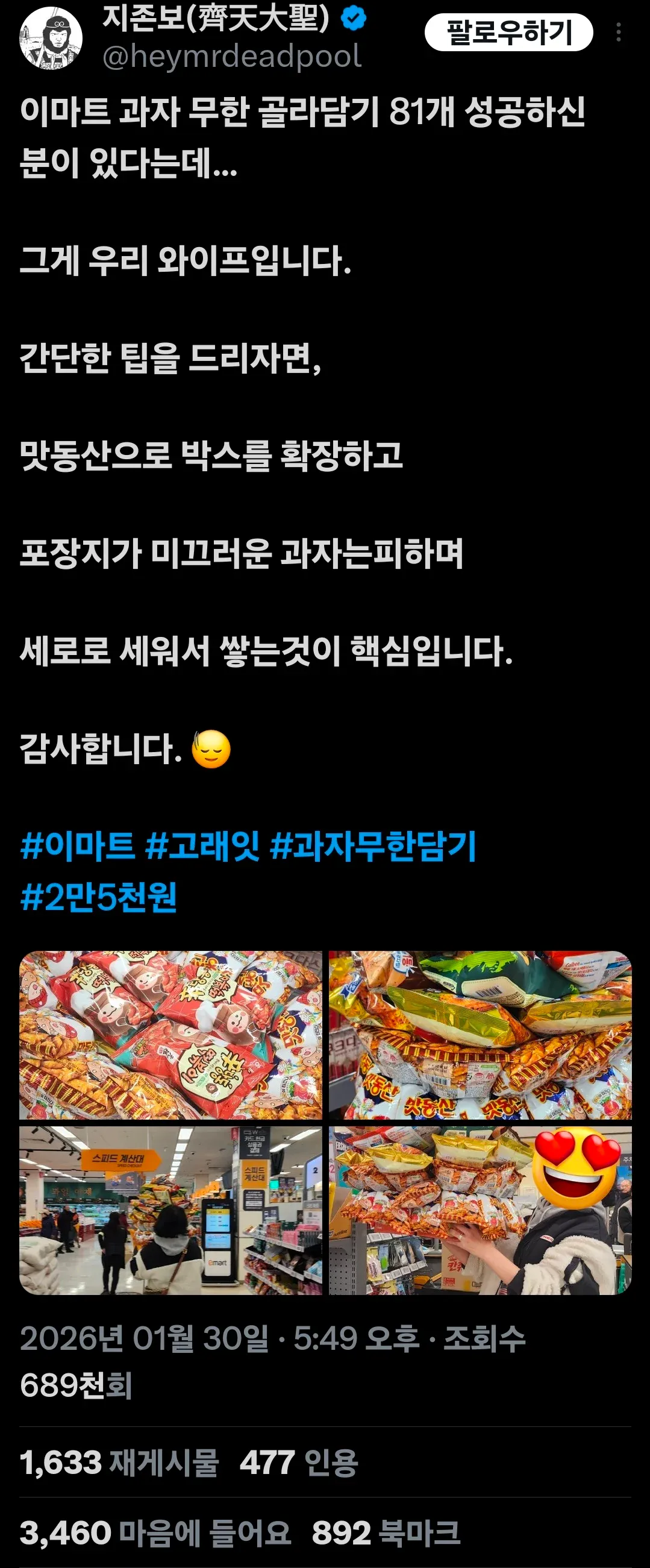 이마트에서 이렇게 박스에 2.5를 내면 과자 무한으로 담을수 있게 해주는 이벤트를 하고있는데 제공하는 박스에만 담아야 하고 카트에 넣으면 안되고 들고가야함 상자크기 능력 껏 담을 수 있을 만큼 담으면 됨 카카오톡 선물하기 하겐다즈 케이크 상태LG 노트북 출시 기념 이벤트캄보디아 조직이 가지고 있는 개인정보 수준낭만 넘치는 90년대 중졸 양아치 만화월급 450 줘도 한국인은 안한다는 중소기업 생산직 사장님