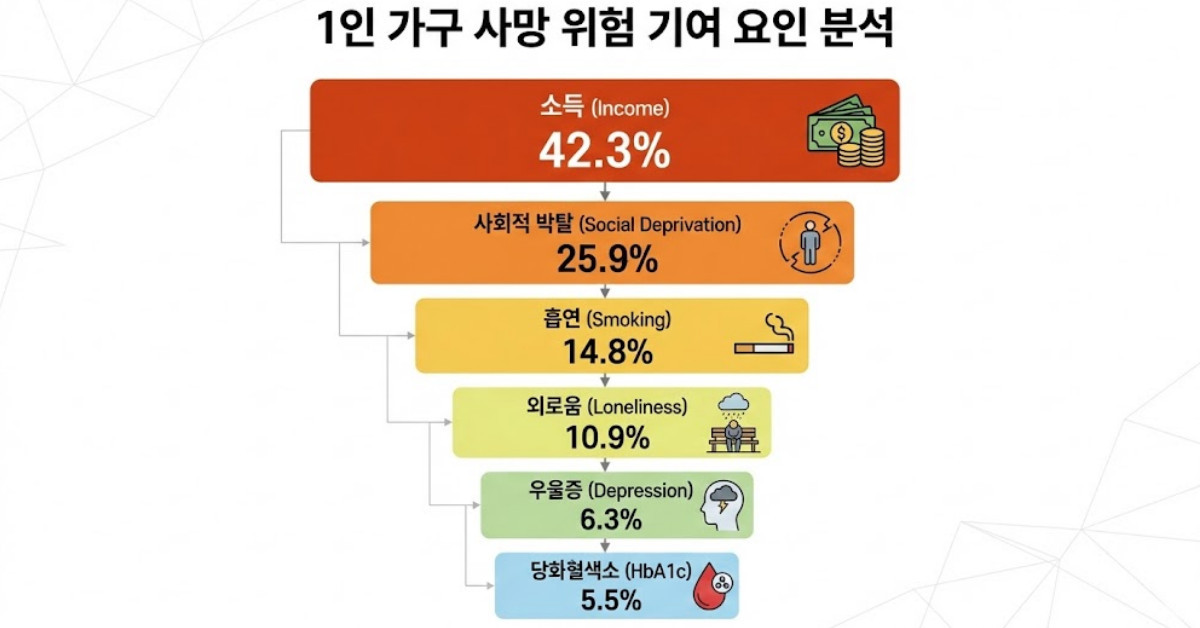 이러한 사망 위험 증가에는 경제적, 심리적 요인과 생활 습관이 복합적으로 얽혀 있었다. 인과 매개분석 결과 소득 수준은 사망 위험 증가에 약 42.3%의 기여도를 보이며 가장 강력한 영향력을 행사하는 요인으로 꼽혔다. 이외에도 사회적 박탈 지수(거주 환경이나 사회적 혜택 등에서 소외된 정도), 흡연, 우울 증상, 외로움이 주요 매개 요인으로 식별됐다. 신체적 지표로는 당화혈색소(HbA1c, 최근 2~3개월 동안의 평균 혈당 수치)와 C-반응성 단백질(몸속 염증 반응을 나타내는 수치)이 상당한 매개 효과를 나타냈으며, 질환 중에서는 심혈관질환과 당뇨병, 고혈압 순으로 영향이 컸다.