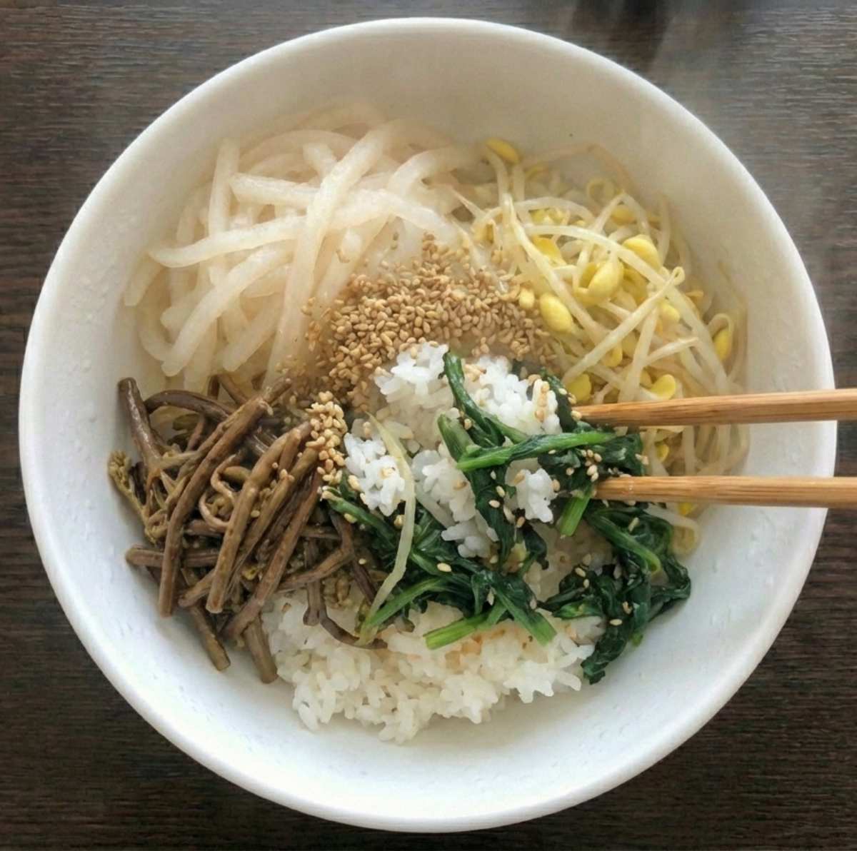 비빔밥으로 즐길 경우 고추장 대신 간장 양념이 잘 어울린다. 조선간장 3큰술을 기본으로 다진 파와 마늘을 각 1큰술씩 넣고, 들기름 2큰술과 깻가루를 넉넉히 더하면 무와 콩나물의 담백함을 해치지 않는다. 참기름보다 들기름을 쓰는 쪽이 맛이 묵직해진다.