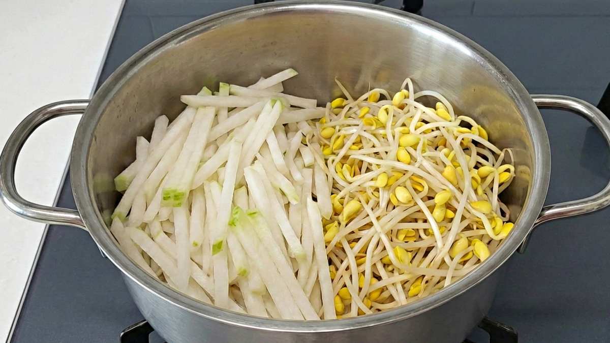 냄비 바닥에는 무를 아주 얇게 한 겹만 깐다. 이 과정은 단순한 배치가 아니라 타는 것을 막는 보호막 역할을 한다. 그 위에 다시마와 표고를 올리고, 남은 무는 왼쪽에, 콩나물은 오른쪽에 나눠 산처럼 담는다. 섞지 않고 나란히 두는 것이 중요하다. 이때 무 쪽에만 천일염 한 꼬집을 뿌리면 삼투압 작용으로 무의 수분이 빠르게 나오며 단맛이 또렷해진다.