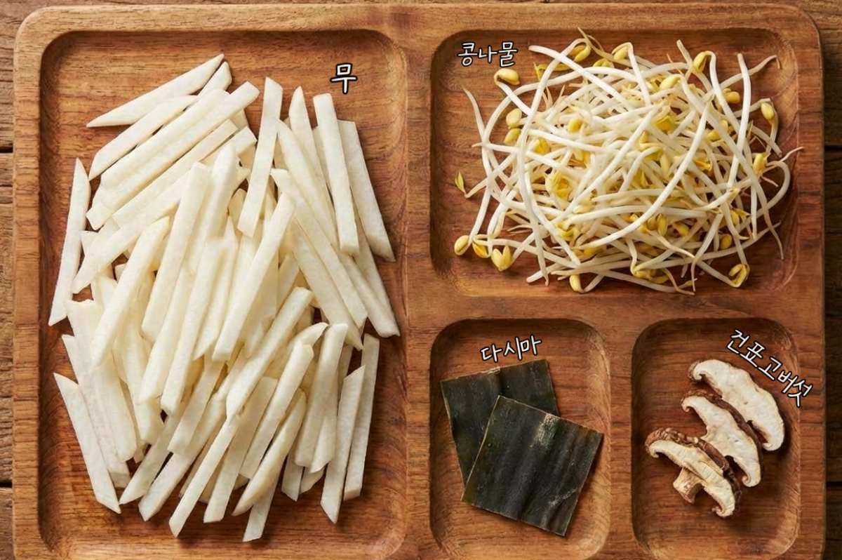 핵심은 재료 비율과 써는 두께다. 무는 약 500g 기준으로 0.5~0.7cm 두께로 도톰하게 채 썬다. 너무 얇으면 조리 과정에서 수분이 과하게 빠져 으깨지기 쉽다. 콩나물도 같은 중량인 500g을 준비해 깨끗이 씻은 뒤 물기를 충분히 빼둔다. 여기에 다시마 2장과 건표고버섯 1~2개가 숨은 역할을 한다. 물 대신 감칠맛을 보태는 장치다.