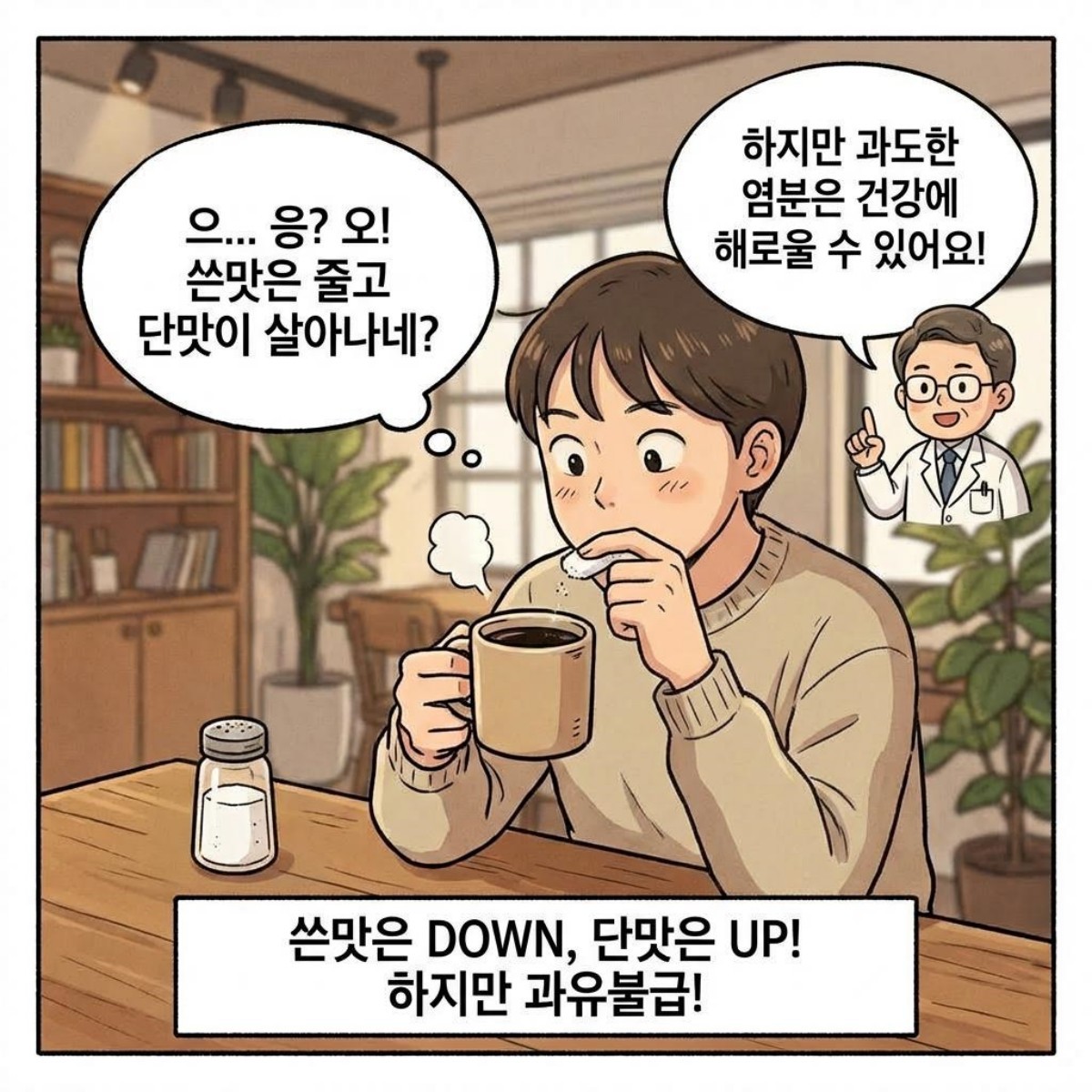 하지만 영국 브래드퍼드대 심리학자 엘리너 브라이언트 박사는 "소금은 카페인의 쓴맛을 완화해 맛을 부드럽게 만들고, 경우에 따라 커피를 더 달게 느끼게 할 수 있다"면서도 "소금이 설탕을 대체해 건강에 이롭다는 주장을 뒷받침할 과학적 근거는 없다"고 말했다. 이어 "이런 방식으로 염분 섭취가 늘어날 경우 오히려 건강에 해로울 수 있으며, 하루에 여러 잔의 커피를 마시는 사람일수록 위험이 커진다"고 밝혔다.