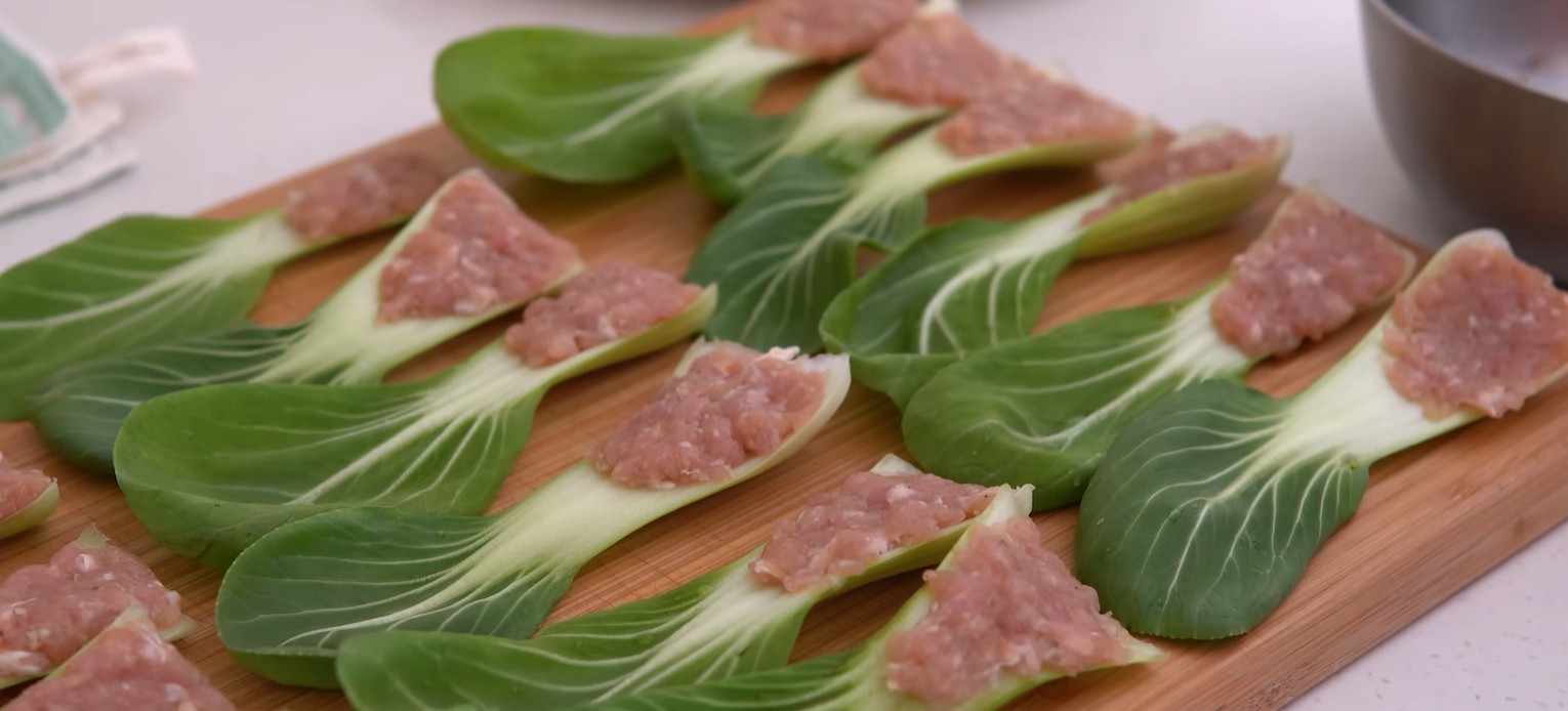 먼저 청경채는 밑동을 살짝 잘라 잎을 한 장씩 분리한 뒤 깨끗이 씻어 물기를 완전히 제거한다. 물기가 남아 있으면 튀김 과정에서 기름이 튀고, 식감도 떨어진다. 돼지고기 다짐육은 볼에 담아 굴소스, 다진 마늘, 소금, 후추를 넣고 충분히 치대준다. 이때 너무 오래 치대면 식감이 딱딱해질 수 있으니 점성이 생길 정도까지만 섞는 것이 좋다.