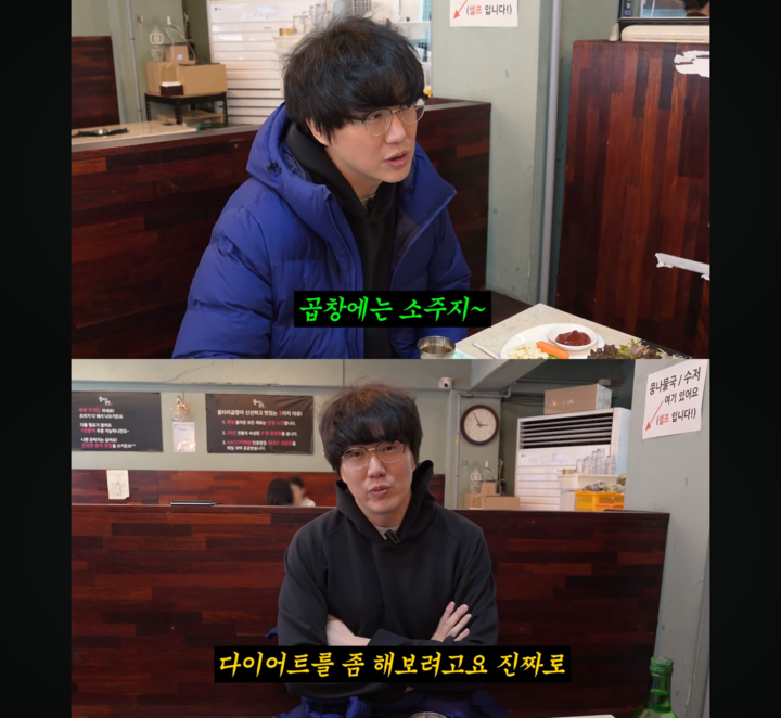 이날 그가 주문한 메뉴는 치즈곱창과 소금막창이었다. 주문 전부터 “추울 때 먹는 곱창이 최고일 것 같다”고 기대감을 드러냈으며, 이어 “곱창에는 역시 소주”라며 자연스럽게 소주를 곁들였다.