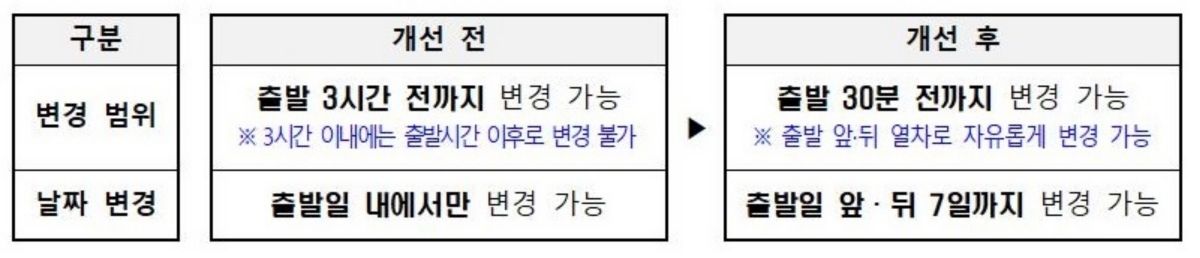 코레일은 이번 개선으로 출발 직전 시간 변경 과정에서 발생하던 불필요한 위약금 부담을 줄이고, 환불·재구매로 인한 좌석 재확보 불안도 완화할 수 있을 것으로 기대하고 있다. 이민성 코레일 고객마케팅단장은 “고객이 원하는 시간의 열차를 부담없이 타실 수 있도록 이용자의 관점에서 국민 눈높이에 맞춘 서비스 개선에 최선을 다하겠다”고 밝혔다.