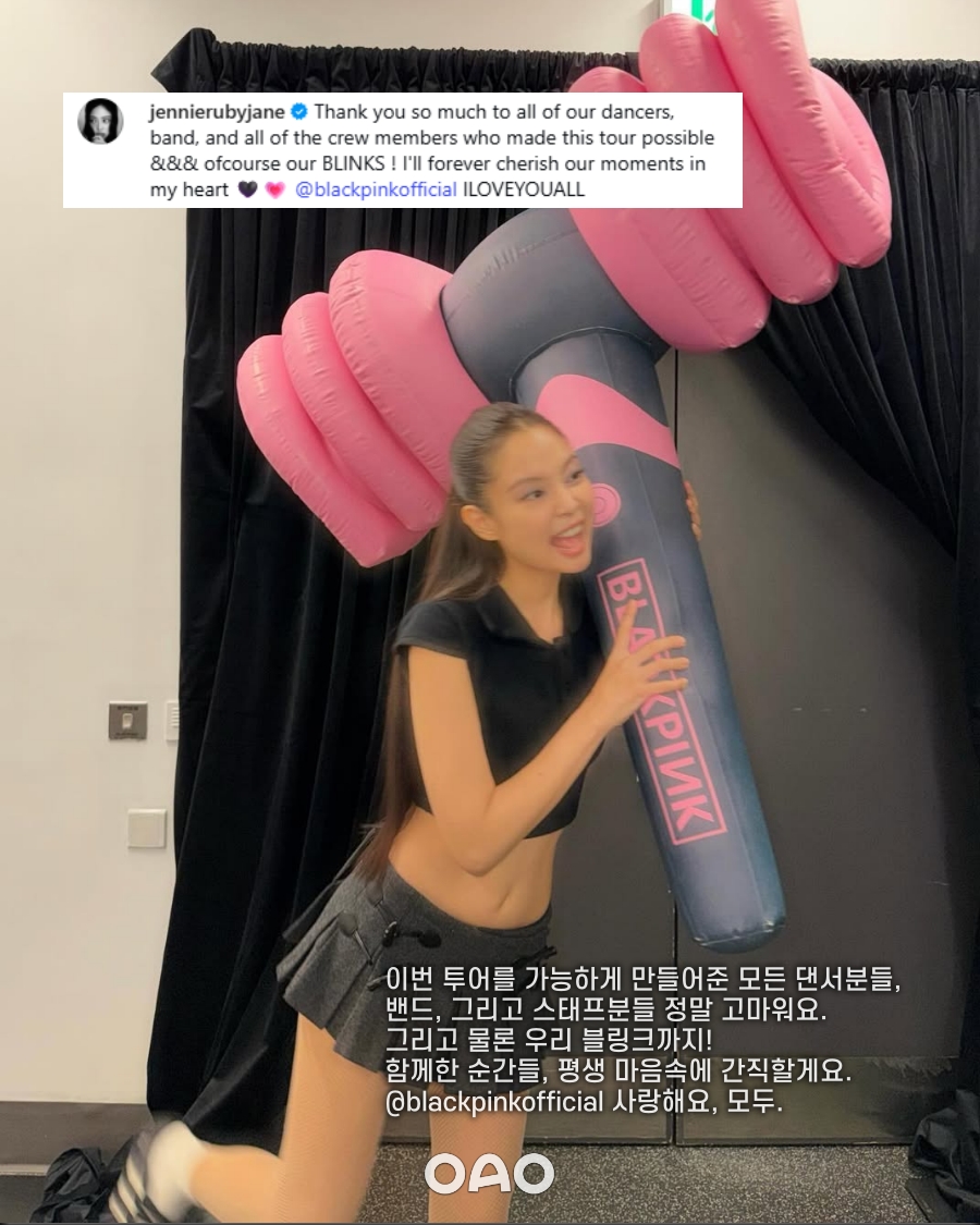 제니는 "이 시간이 너무 그리울 것 같아"라고 멤버들과 함게한 시간을 회상했다. 이어 "이번 투어를 가능하게 만들어준 모든 댄서분들, 밴드, 그리고 스태프분들 정말 고마워요. 그리고 물론 우리 블링크까지! 함께한 순간들, 평생 마음속에 간직할게요. 블랙핑크 사랑해요, 모두"라고 남다른 애정을 표현했다.