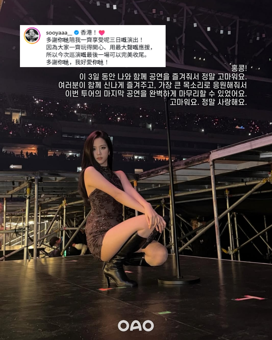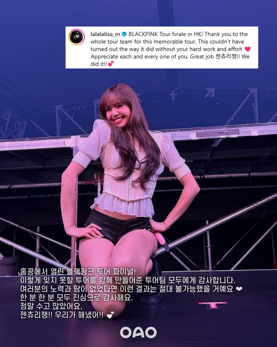 리사는 "홍콩에서 열린 블랙핑크 투어 파이널! 이렇게 잊지 못할 투어를 함께 만들어준 투어팀 모두에게 감사합니다. 여러분의 노력과 땀이 없었다면 이런 결과는 절대 불가능했을 거예요. 한 분 한 분 모두 진심으로 감사해요. 정말 수고 많았어요, 젠츄리챙!! 우리가 해냈어!"라는 생기 넘치는 소감으로 뭉클함을 더했다.