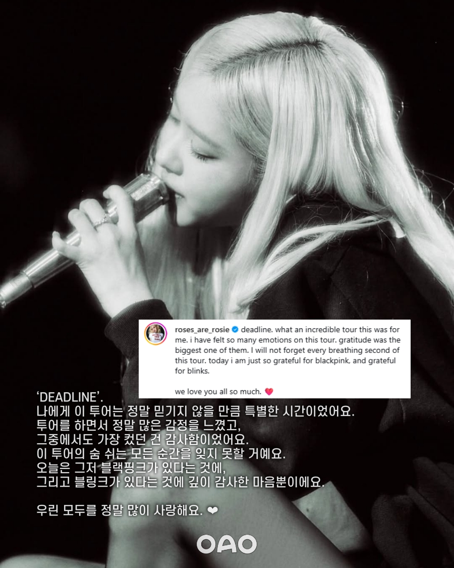 로제는 "‘DEADLINE’. 나에게 이 투어는 정말 믿기지 않을 만큼 특별한 시간이었어요. 투어를 하면서 정말 많은 감정을 느꼈고, 그중에서도 가장 컸던 건 감사함이었어요. 이 투어의 숨 쉬는 모든 순간을 잊지 못할 거예요. 오늘은 그저 블랙핑크가 있다는 것에, 그리고 블링크가 있다는 것에 깊이 감사한 마음뿐이에요"라며 "모두를 정말 많이 사랑해"라고 덧붙이며 소감을 마무리 지었다.