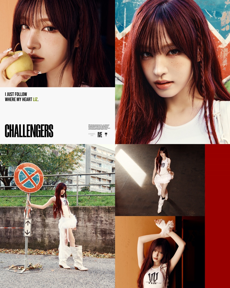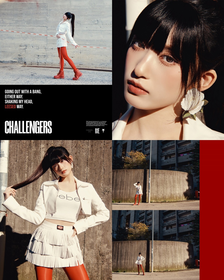 리즈는 깊은 눈빛으로 카메라를 응시해 몽환적인 분위기를 자아낸 가운데, 'I JUST FOLLOW WHERE MY HEART LIZ(난 그냥 내 마음이 있는 쪽을 따를 뿐이야)'라는 문구를 완성했고, 마지막으로 이서는 레드 컬러의 타이즈와 포니테일로 유니크하면서도 스타일리시한 패션을 선보이며 'GOING OUT WITH A BANG, EITHER WAY. SHAKING MY HEAD, LEESEO WAY(어차피 끝은 화려하게, 고개를 흔들며, 이서답게)'라는 문구로 사진을 완성, 6인 6색의 한계 없는 비주얼을 자랑했다.