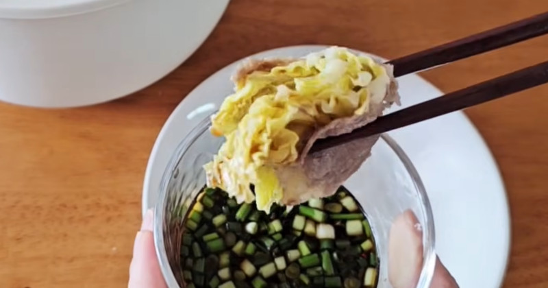찜기에 배추 밀푀유를 세워 담고, 센 불이 아닌 중불에서 천천히 쪄준다. 물이 끓기 시작한 뒤 8~10분 정도면 충분하다. 우삼겹이 완전히 익고 배추가 투명해지면 불을 끈다. 이때 배추에서 나온 수분과 고기 육즙이 바닥에 고이는데, 이 국물 자체가 이미 훌륭한 육수가 된다. 따로 양념을 하지 않아도 재료 본연의 맛이 또렷하다.